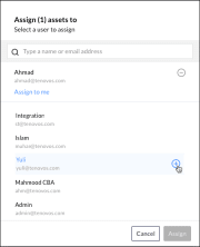 In the Assign (x) assets to window, scroll to the user’s name/email address or enter it in the search field. Then hover over the name in the list and click its icon to select it.