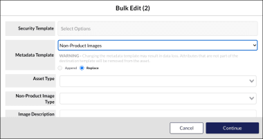 You can bulk edit assets in the Action Required, Approved, or Rejected tabs. Select the assets in the request that you want to modify, then click Bulk Edit in the task bar. The Bulk Edit (x) window opens.