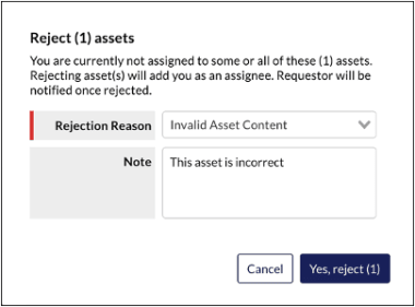 Select the assets you want to reject then click Reject in the task bar. The Reject (x) assets window appears.