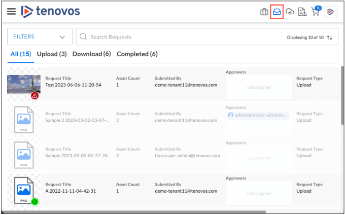 Upload requests and download requests are sent to the Requests Inbox of all users ("approvers") with the Requests Inbox and Request Management privileges. This allows them to view the Requests inbox and review asset upload and download requests for approval and/or rejection.