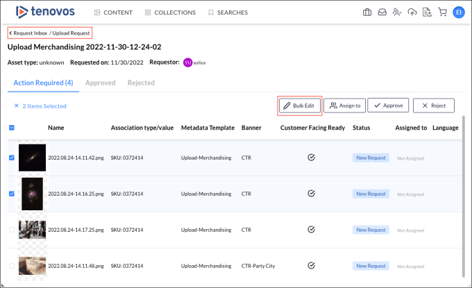 In the Requests inbox, you can bulk edit assets in upload requests in the Action Required, Approved, or Rejected tabs. The Bulk Edit option operates the same as when applied via the Content gallery.