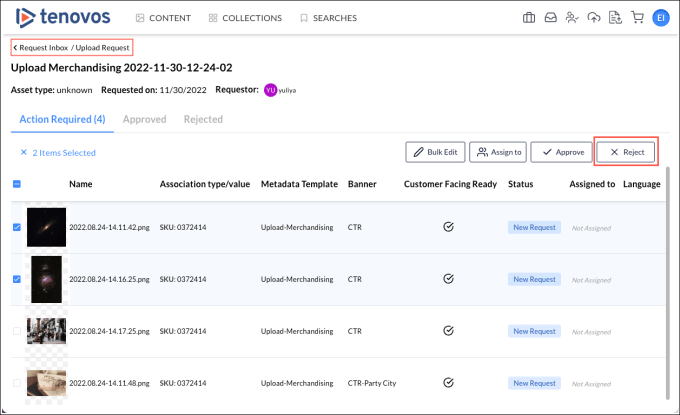The Action Required tab displays all assets submitted for review in the upload request that have not yet been approved or rejected.